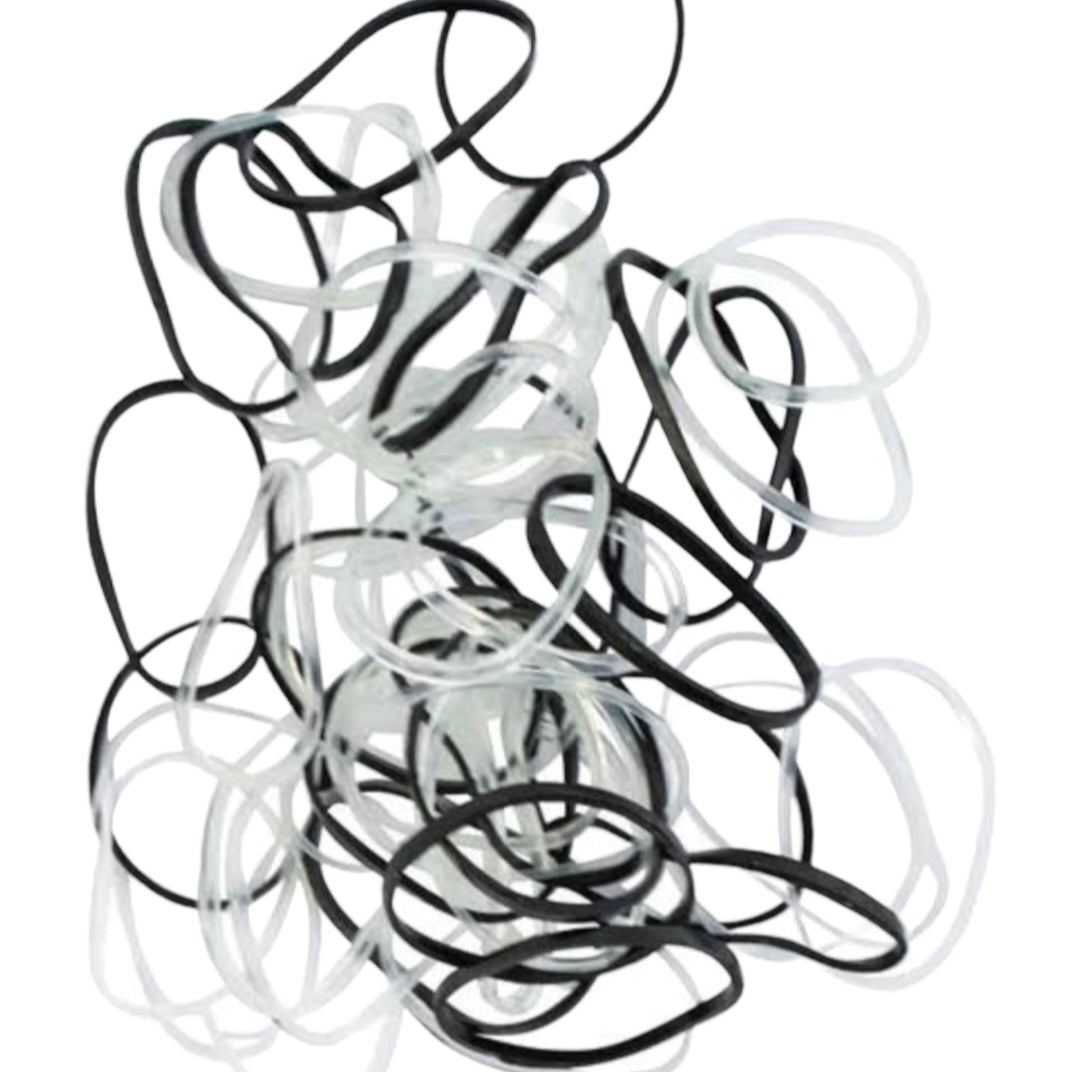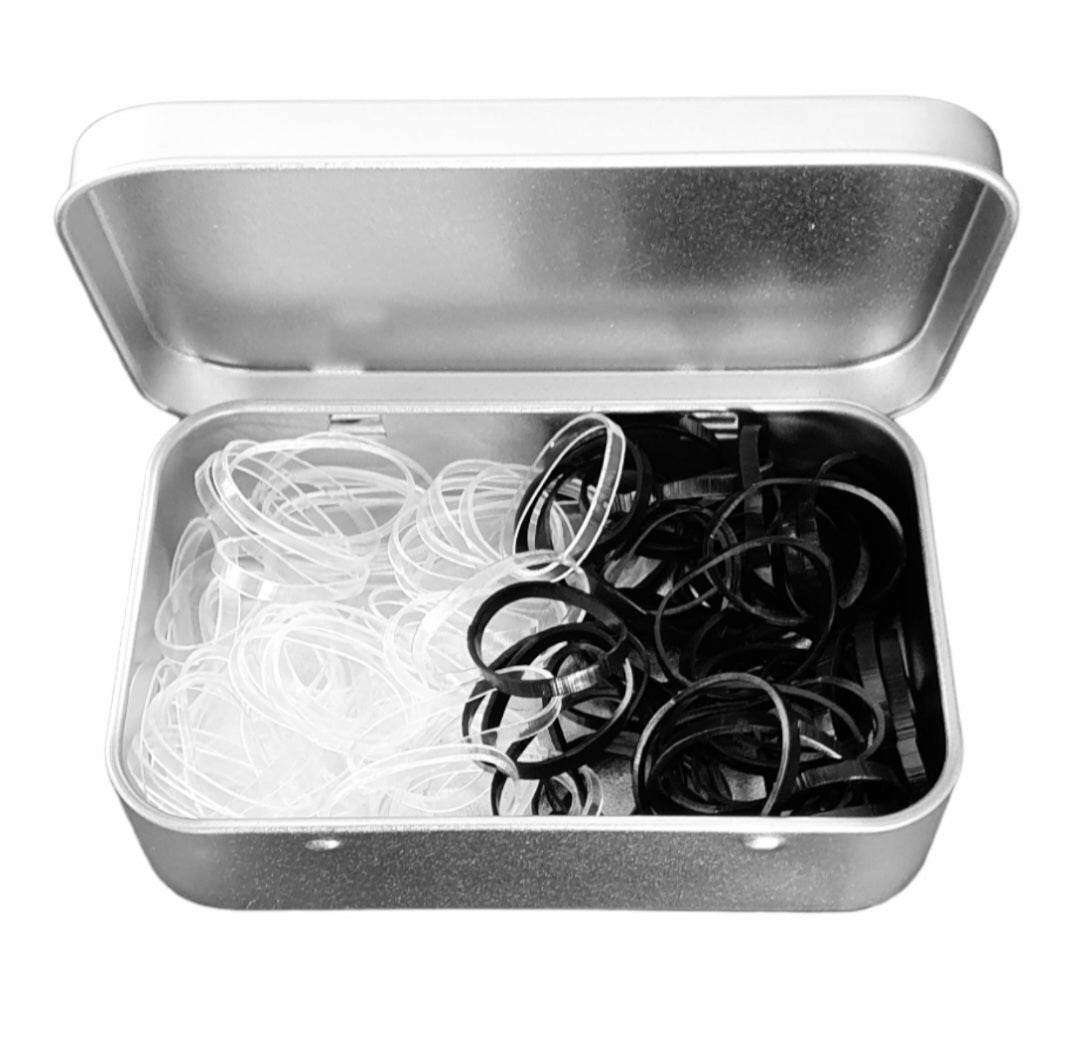 Keep your hair perfectly styled with this premium set of 100 Polyband Hair Ties, presented in a sleek, reusable silver tin case. These polybands are soft, stretchy and no-slip, offering a secure hold without pulling, snagging, or causing breakage